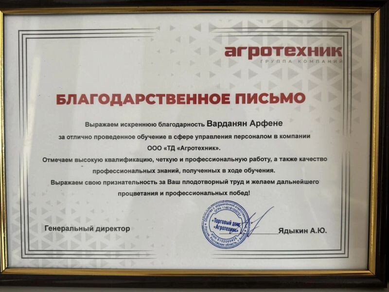 - ООО «ТД "Агротехник"», благодарственное письмо за отлично проведённое обучение в сфере управления персоналом в компании, 2024 г.