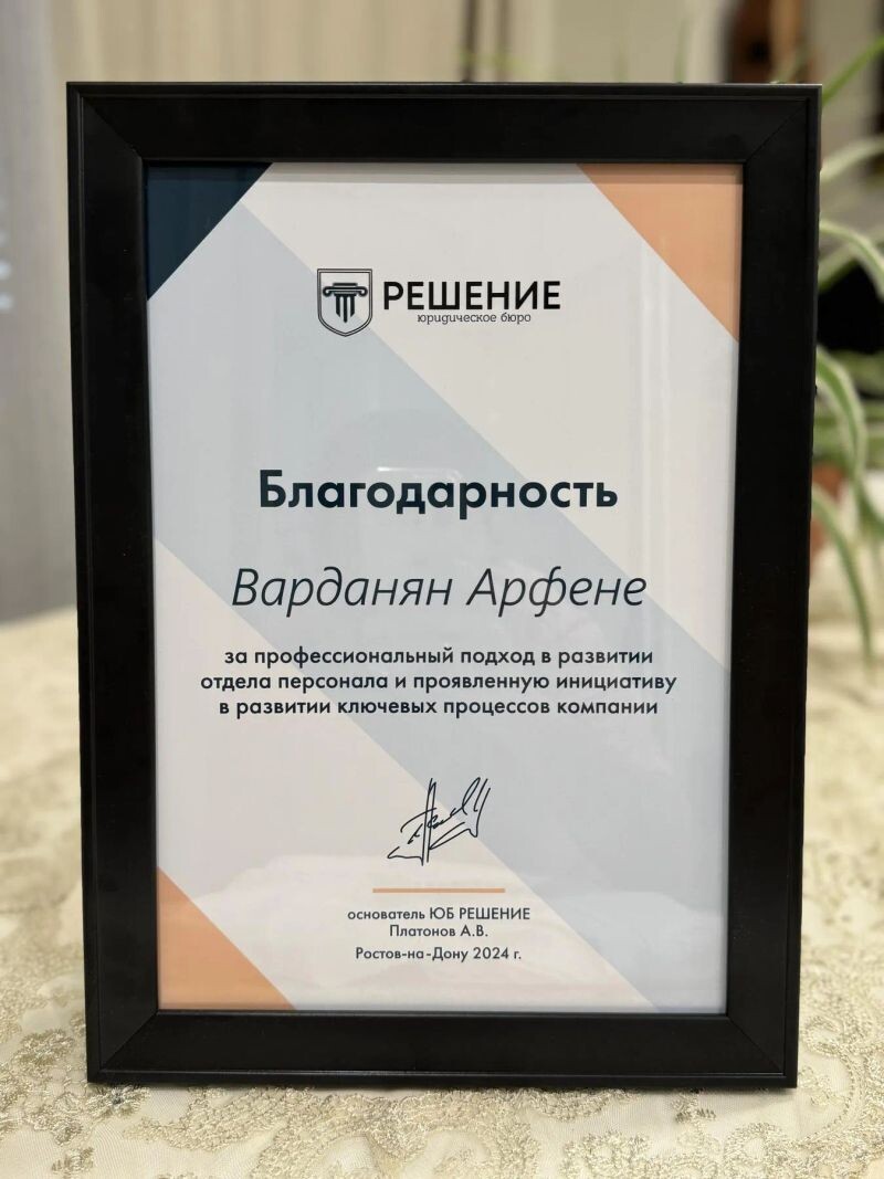 - Юридическое бюро «Решение», благодарность за профессиональный подход в развитии отдела персонала и проявленную инициативу в развитии ключевых процессов компании, 2024 г.
