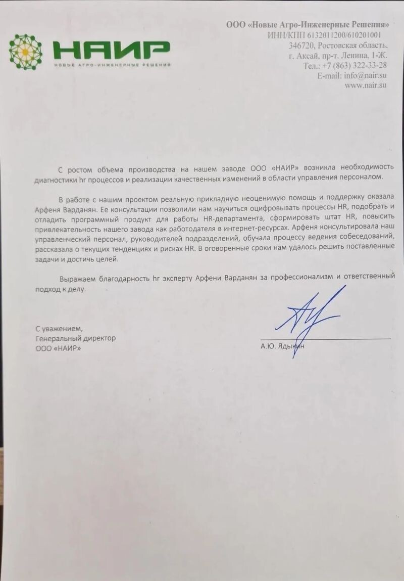 - ООО «НАИР», благодарность за профессионализм и ответственный подход к делу, 2024 г.