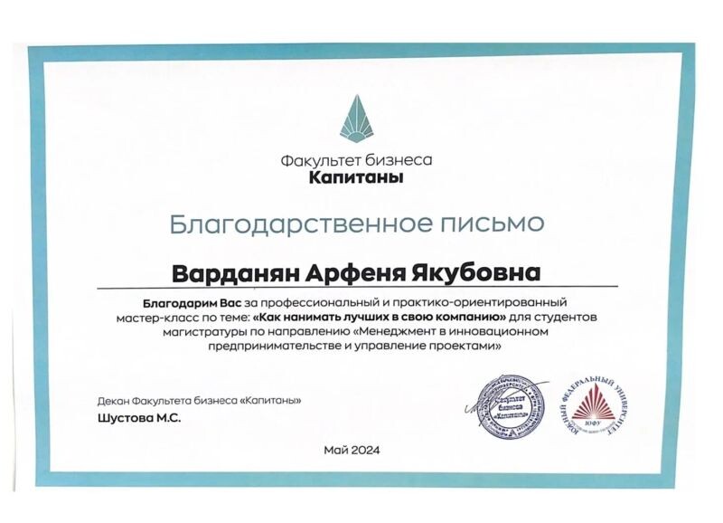 - Благодарность от ЮФУ за проведение мастер-класса, 2024 г.