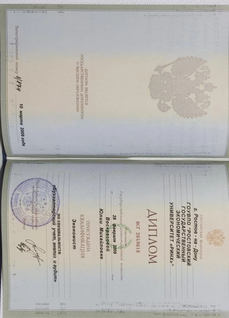 - Ростовский государственный экономический университет, бухгалтерский учёт, анализ и аудит, экономист, 2009 г.