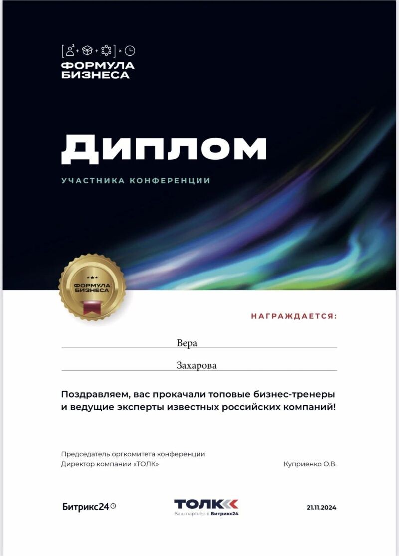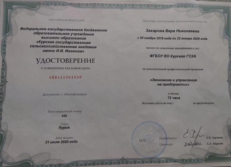 - Удостоверение Экономика и управление предприятием (с 2020 г.).