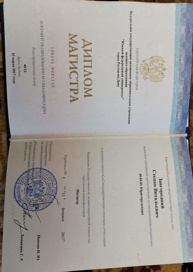 - Южный федеральный университет, юриспруденция, 2015–2017 гг.