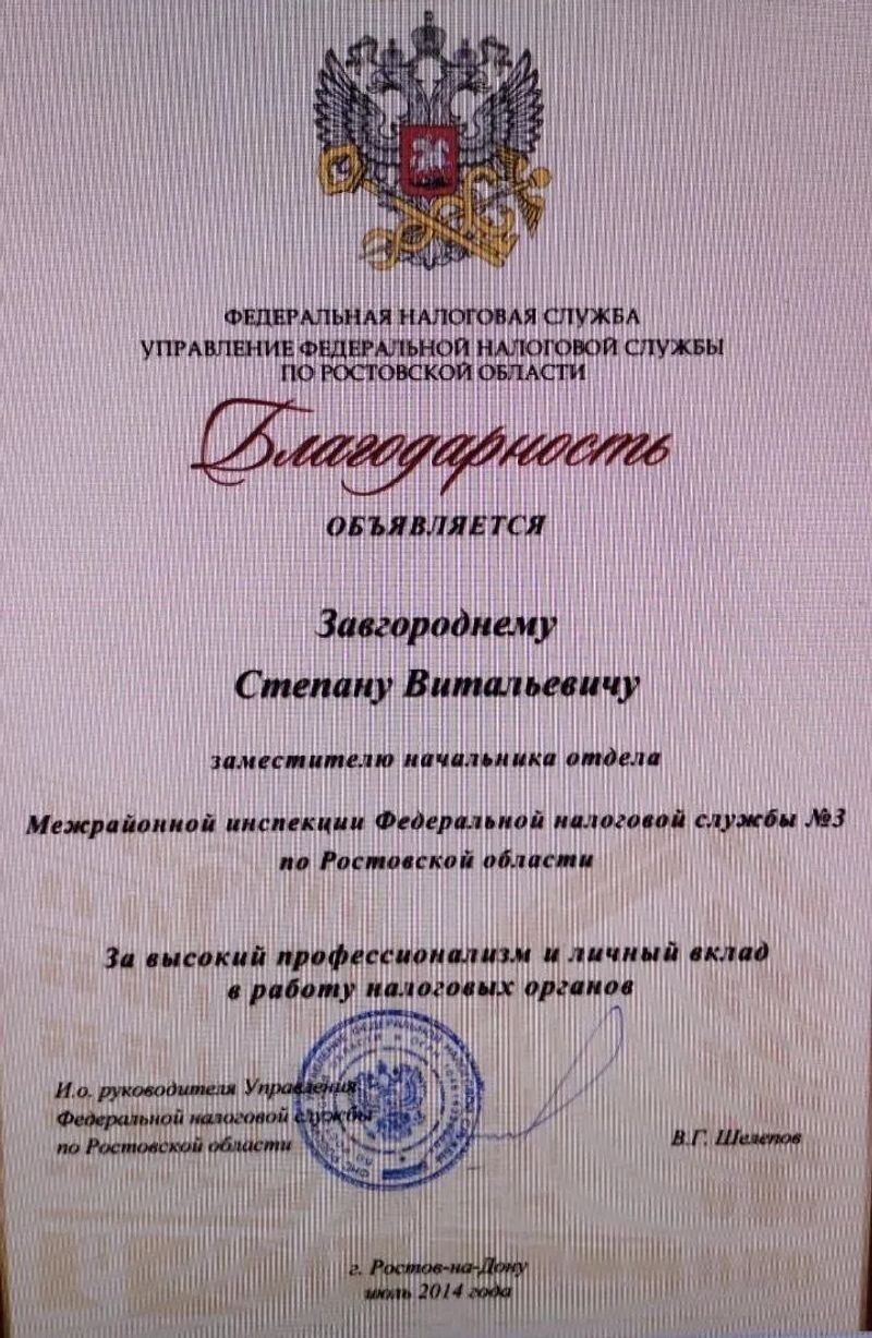 - Федеральная налоговая служба управления федеральной налоговой службы по Ростовской области, благодарность, 2014 г.