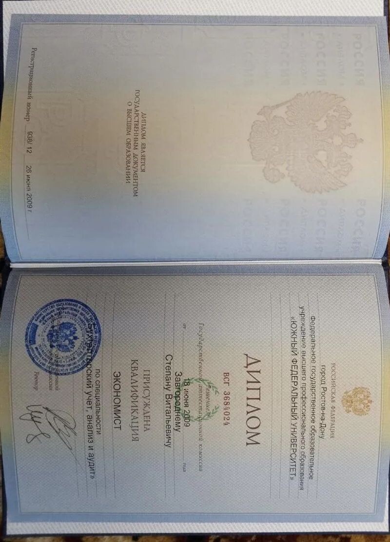 - Южный федеральный университет, экономист, бухгалтерский учёт, анализ и аудит, 2004–2009 гг.