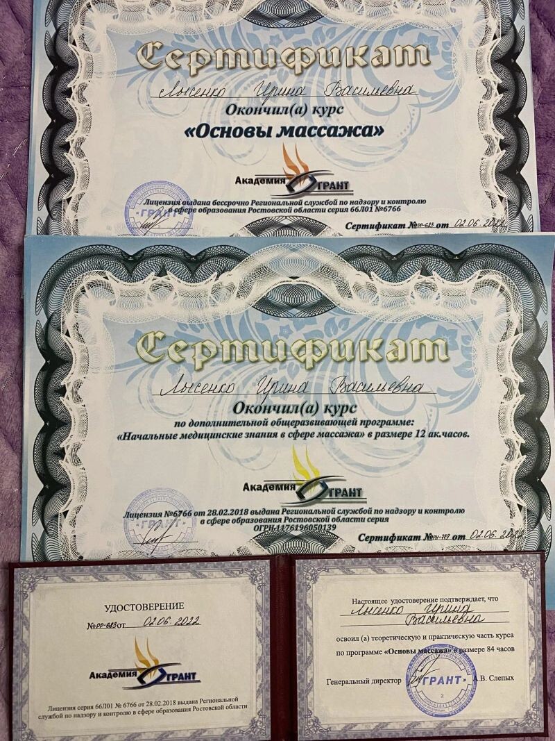 - Академия «Грант», курс «Основы массажа», программа «Начальные медицинские знания в сфере массажа», 2022 г.