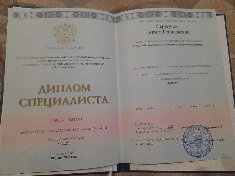 - Ростовский государственный университет путей сообщений, инженер, 2010–2015 гг.