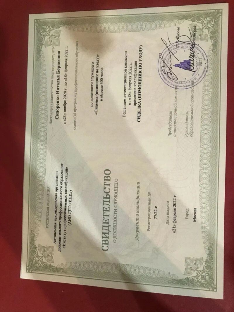 - АНО ДПО «ИПК», сиделка (помощник по уходу), 2022 г.