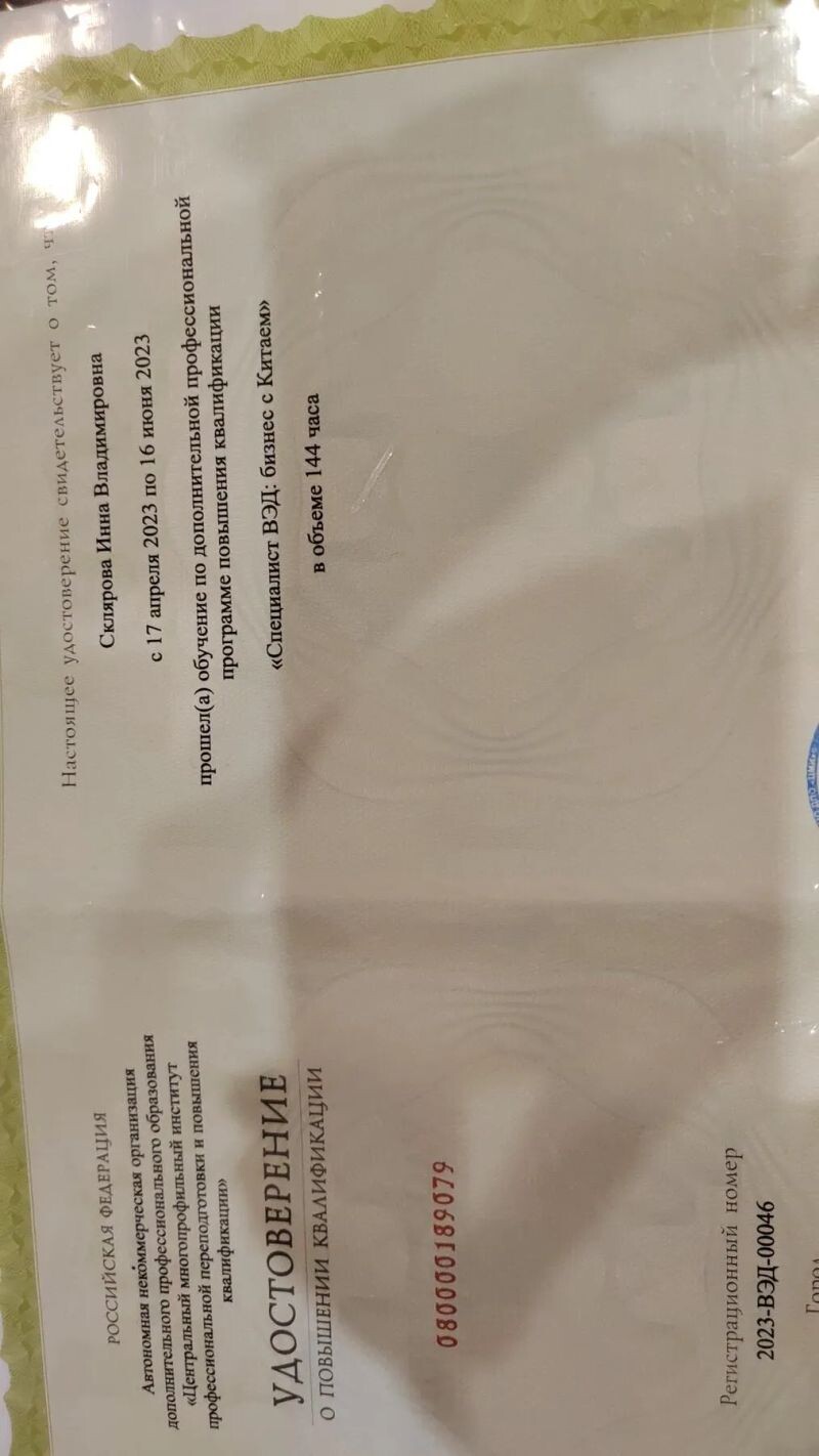 - АНО ДПО «Центральный многопрофильный институт профессиональной переподготовки и повышения квалификации», программа «Специалист ВЭД: бизнес Китаем», 2023 г.