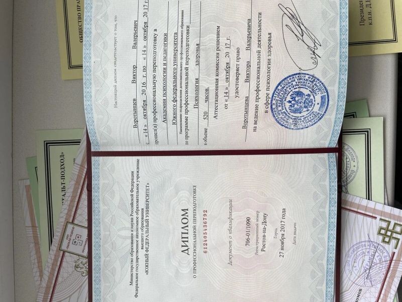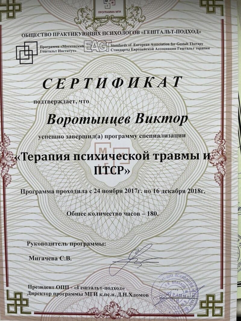 - Общество практикующих психологов «Гештальт-подход», сертификат о завершении программы специализации «Терапия психической травмы и ПТСР», 2018 г.