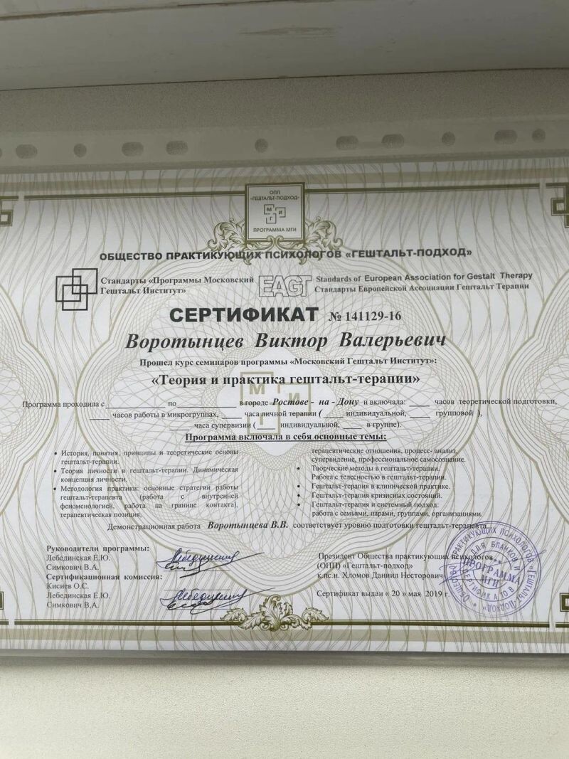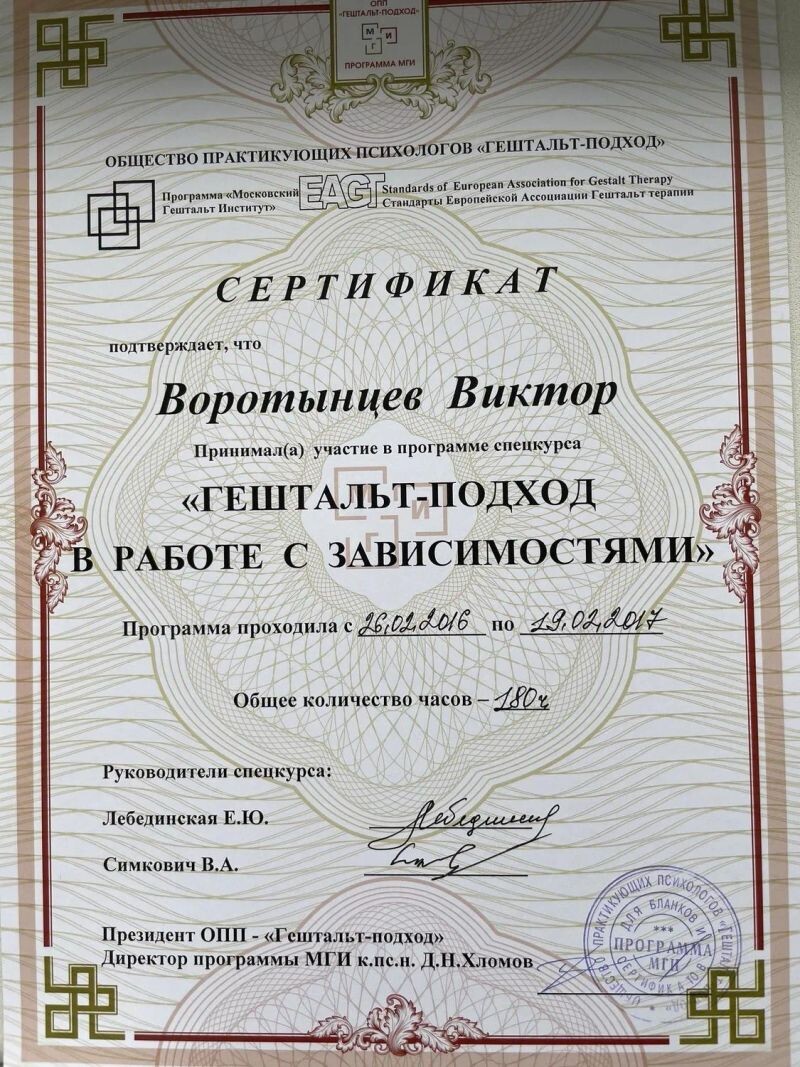 - Общество практикующих психологов «Гештальт-подход», сертификат участника программы спецкурса «Гештальт-подход в работе с зависимостями», 2017 г.