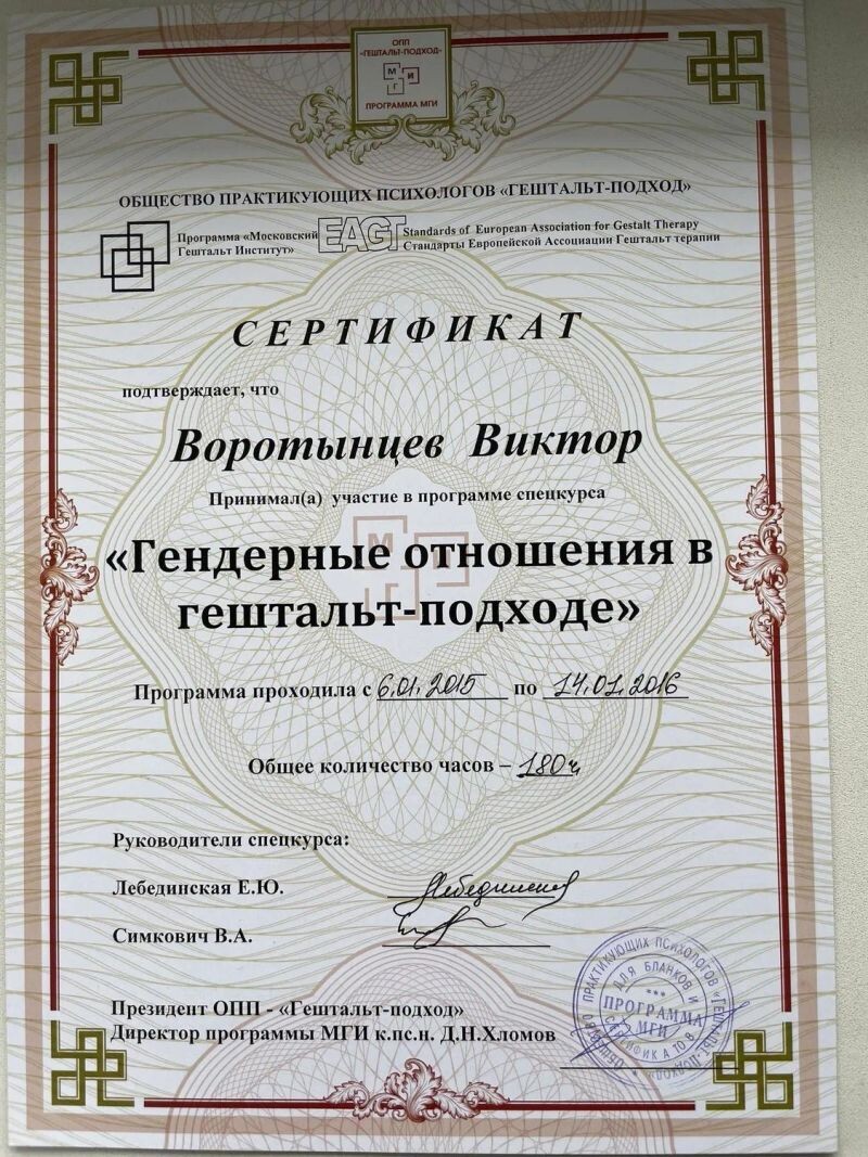 - Общество практикующих психологов «Гештальт-подход», сертификат участника программы спецкурса «Гендерные отношения в гештальт-подходе», 2016 г.