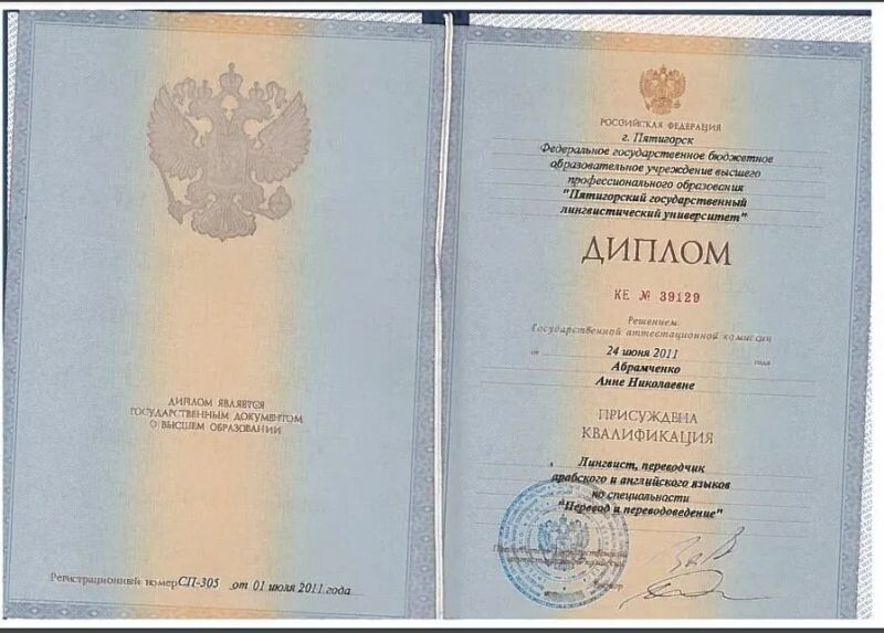 - Пятигорский государственный лингвистический университет, квалификация «лингвист-переводчик арабского и английского языков», специальность «перевод и переводоведение», специализация «перевод в сфере бизнеса и предпринимательства», 2006–2011 гг.
