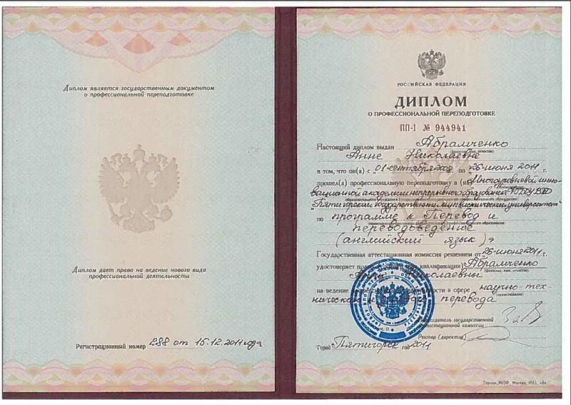 - Многоуровневая инновационная академия непрерывного образования, Пятигорский государственный лингвистический университет, программа «Перевод и переводоведение (английский язык)», специализация «научно-технический и деловой перевод», 2008–2011 гг.