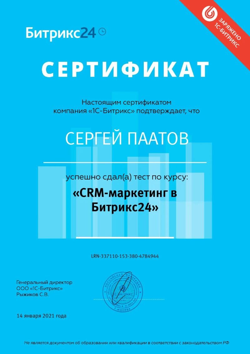 - ООО «1С-Битрикс», курс «CRM-маркетинг в Битрикс24», 2021 г.