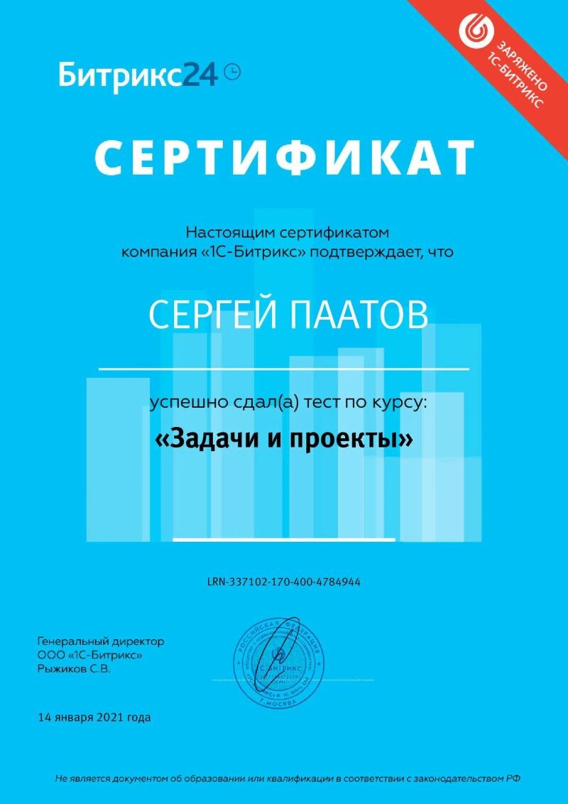 - ООО «1С-Битрикс», курс «Задачи и проекты», 2021 г.