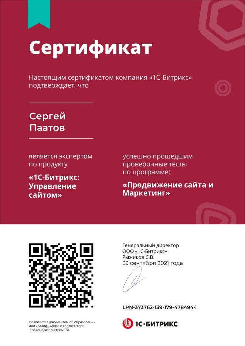 - ООО «1С-Битрикс», курс «Продвижение сайта и маркетинг», 2021 г.