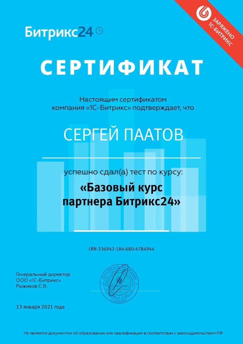- ООО «1С-Битрикс», курс «Базовый курс партнёра Битрикс24», 2021 г.