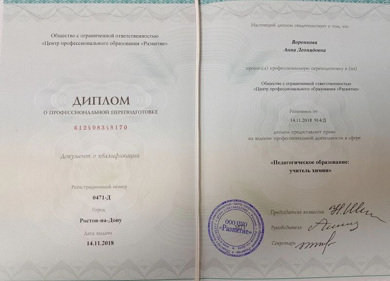 - ЦЕНТР ПРОФЕССИОНАЛЬНОГО ОБРАЗОВАНИЯ "РАЗВИТИЕ", специальность учитель химии, 2017–2018 гг.