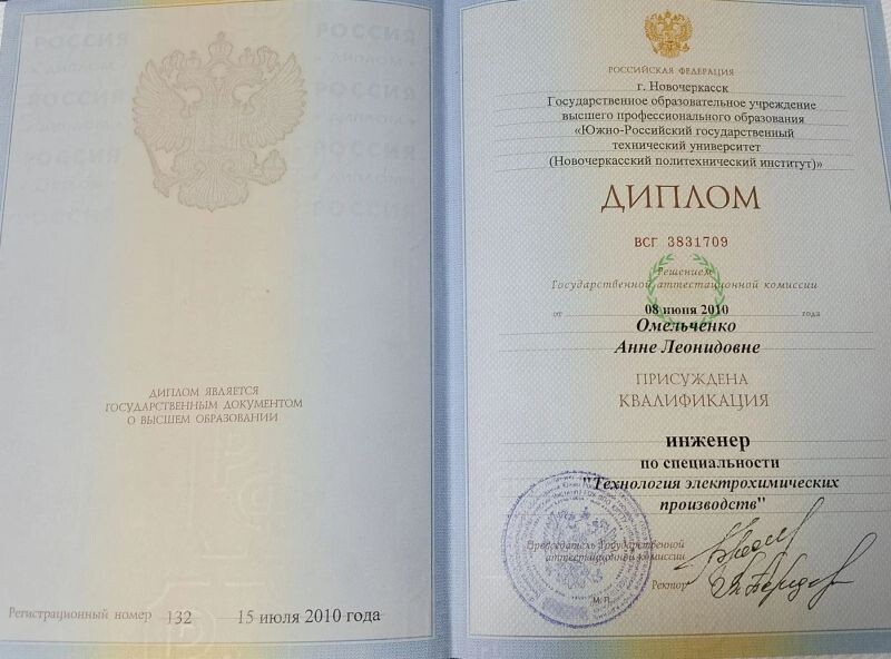 - Южно-Российский государственный технический университет (Новочеркасский политехнический институт), химический факультет, технология электрохимических производств, 2005–2010 гг.
