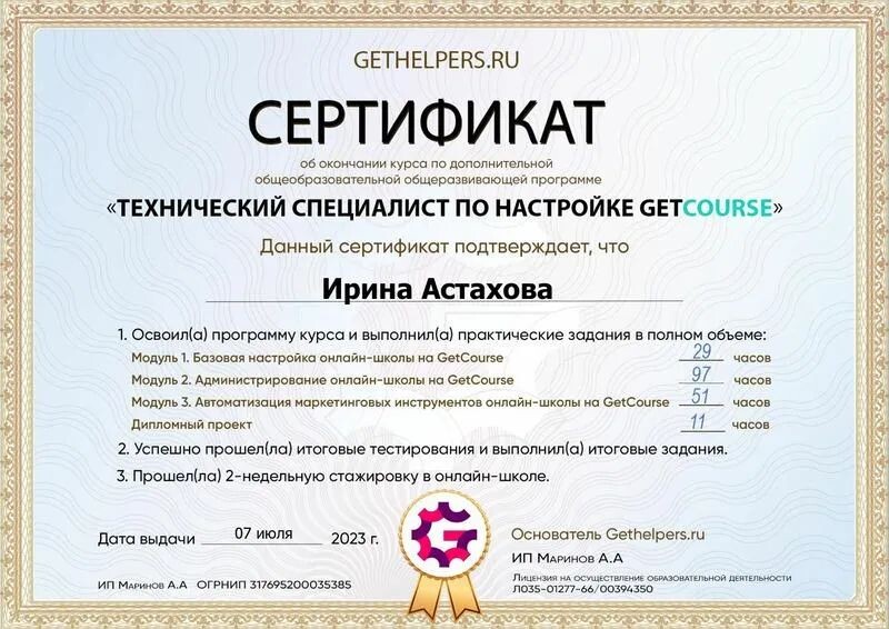 - Прошла курсы технического специалиста по работе с платформой GetCourse (с 2023 г.).