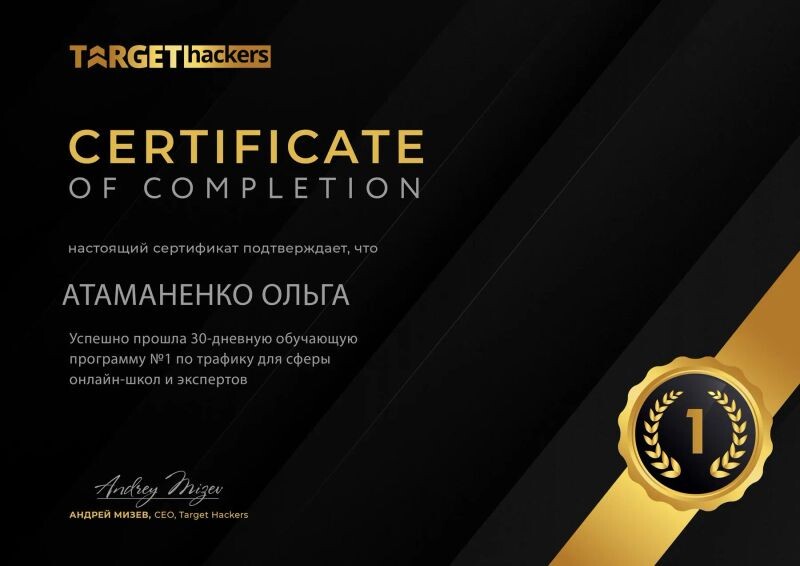 - Сертификат об окончании 30-дневной обучающую программу N°1 по трафику для сферы онлайн-школ и экспертов, 2021 г.