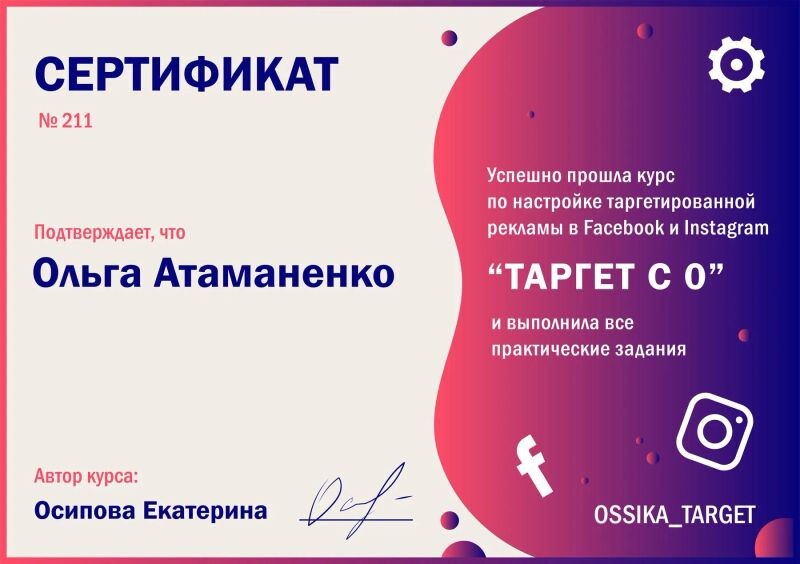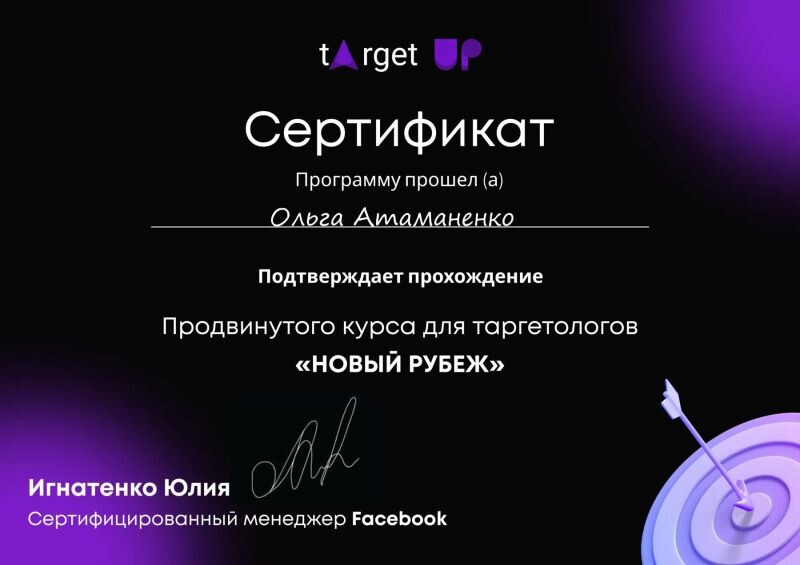 - Сертификат об окончании продвинутого курса для таргетологов «Новый рубеж», 2021 г.