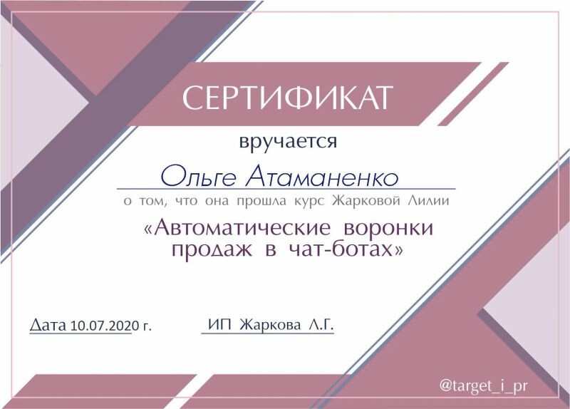 - Сертификат об окончании курса «Автоматические воронки продаж в чат-ботах», 2020 г.