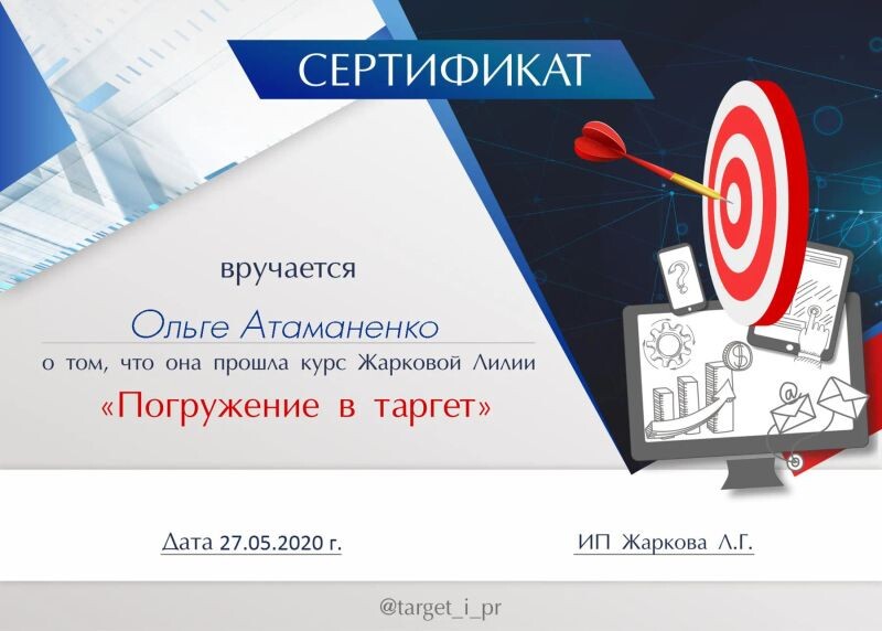 - Сертификат об окончании курса «Погружение в таргет», 2020 г.