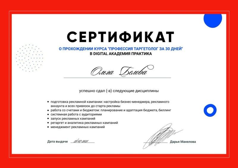 - Digital Академия практики Дарьи Манеловой, курс «Профессия таргетолог», 2021 г.