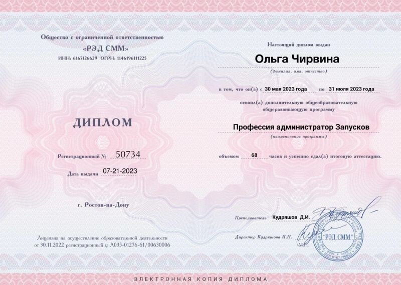 - ООО «РЭД СММ», программа «Профессия – администратор запусков», 2023 г.