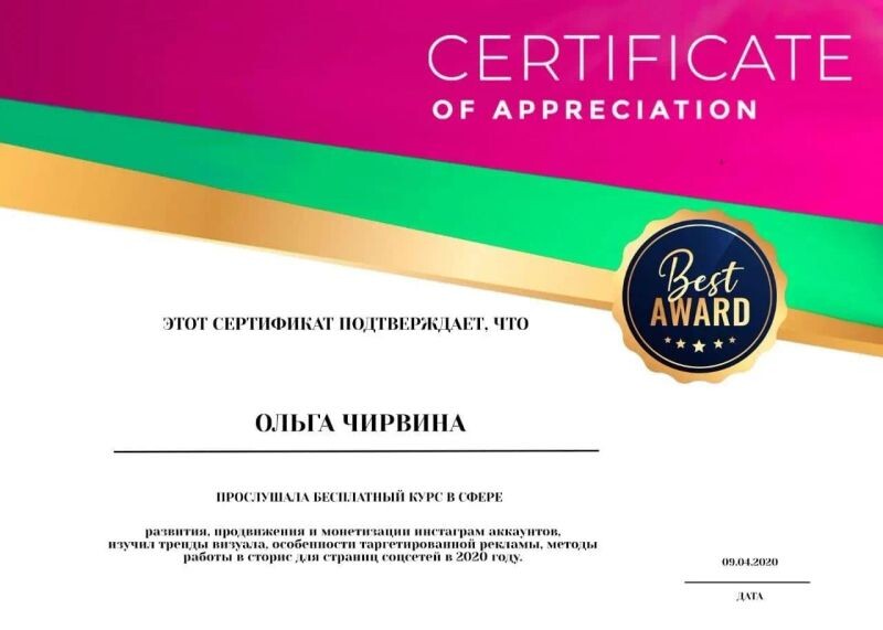 - Курс «Развитие инстаграм-аккаунтов», 2020 г.