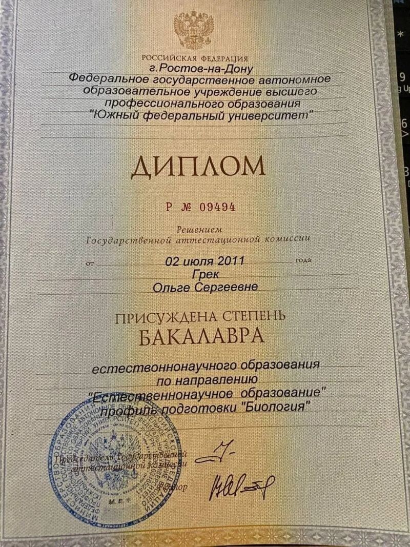- Южный федеральный университет, естественнонаучное образование, профиль подготовки – биология, 2007–2011 гг.
