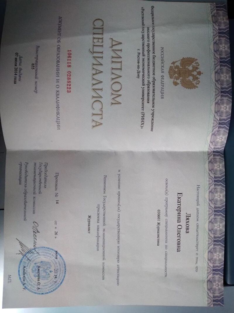 - Ростовский государственный экономический университет "РИНХ" Специальность "Журналистика", 2009–2014 гг.