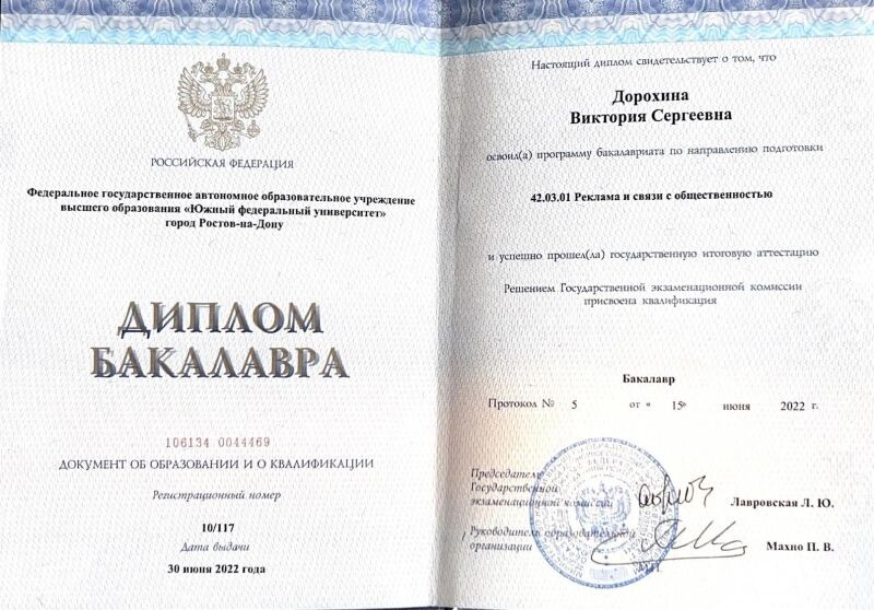 - Южный федеральный университет, Институт филологии и межкультурных коммуникаций, специализация — реклама и связи с общественностью, 2017–2022 гг.