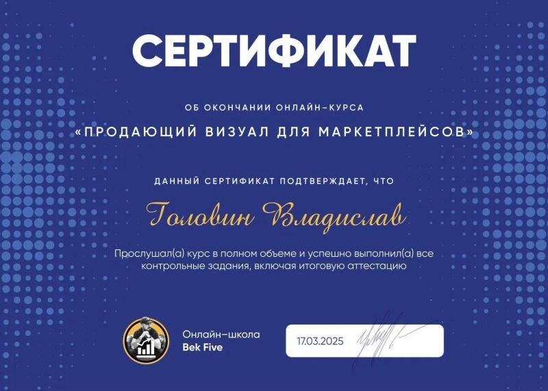 - Онлайн-школа Bek Five, курс «Продающий визуал маркетплейсов», 2025 г.