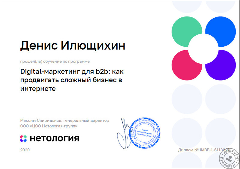 - Университет онлайн-профессий «Нетология», программа «Digital-маркетинг для b2b», 2020 г.