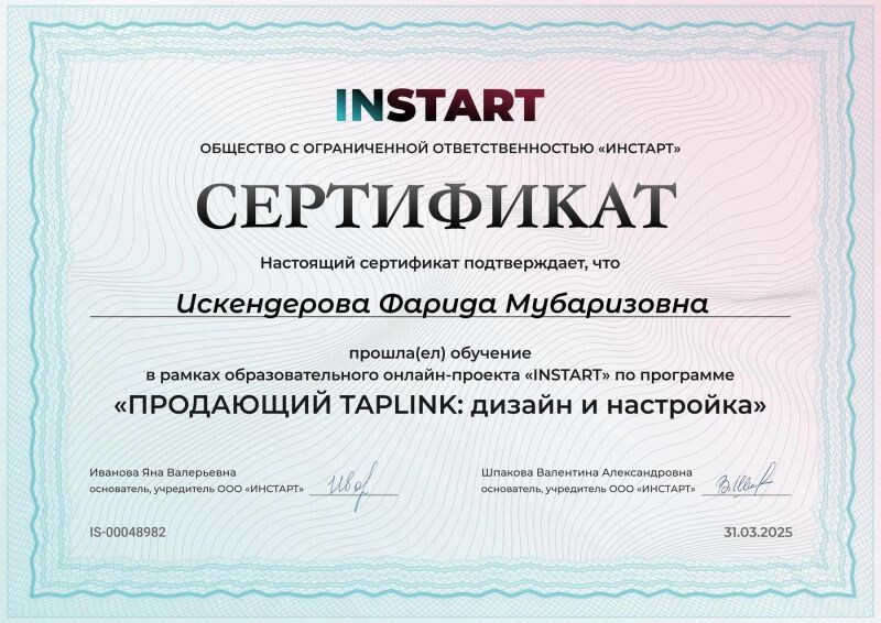- INSTART, продающий TAPLINK: дизайн и настройка, 2025 г.