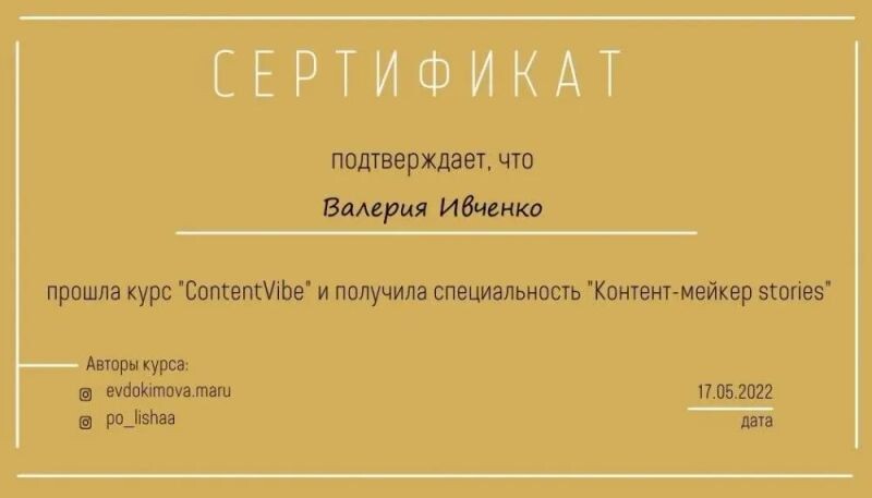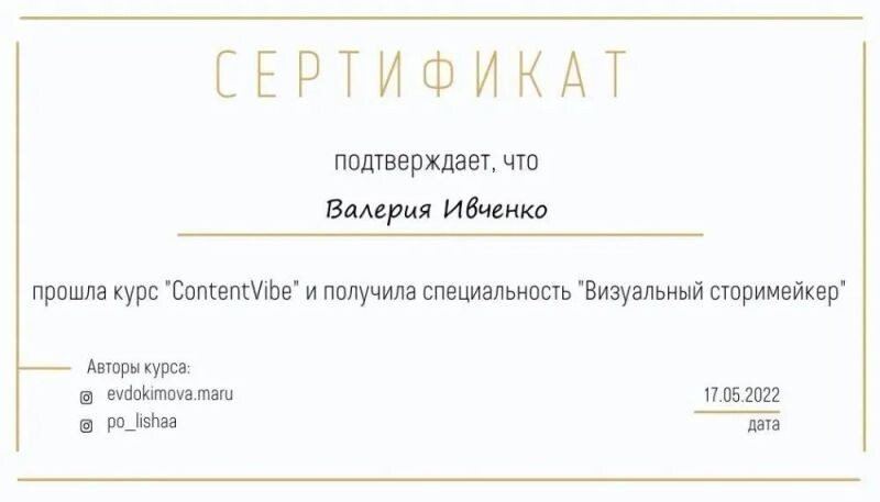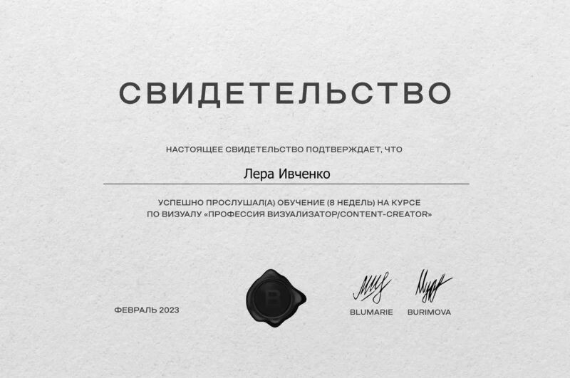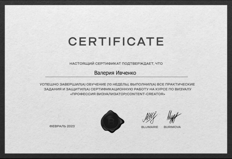 - Свидетельство о прохождении обучения по визуалу «Профессия визуализатор/content-creator», в школе контента Саши Буримовой в соавторстве с Блюмари (с 2023 г.).