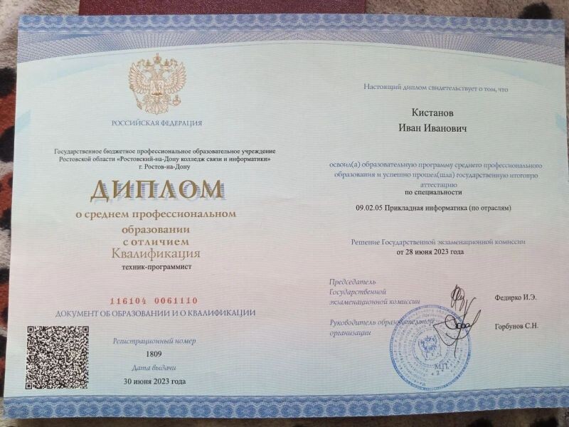 - Ростовский-на-Дону колледж связи и информатики, Прикладная информатика (по отраслям), техник-программист, 2019–2023 гг.
