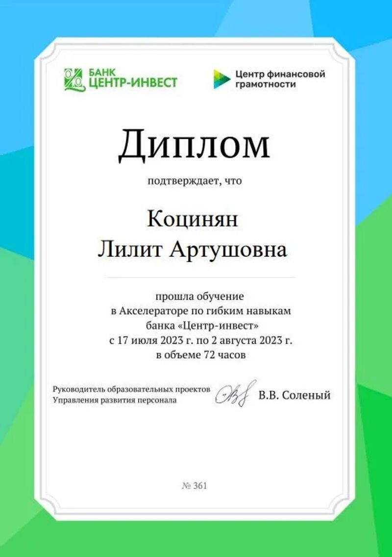 - Банк «Центр-Инвест», диплом об окончании Акселератора по гибким навыкам «Центр-Инвест», 2023 г.
