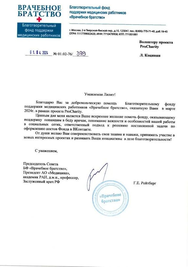 - Благотворительный фонд поддержки медицинских работников «Врачебное братство», благодарность за помощь в маркетинге (с 2024 г.).