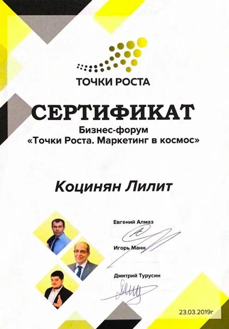 - «Точки роста», сертификат бизнес-форума Игоря Манна «Точки роста. Маркетинг в космос», 2019 г.