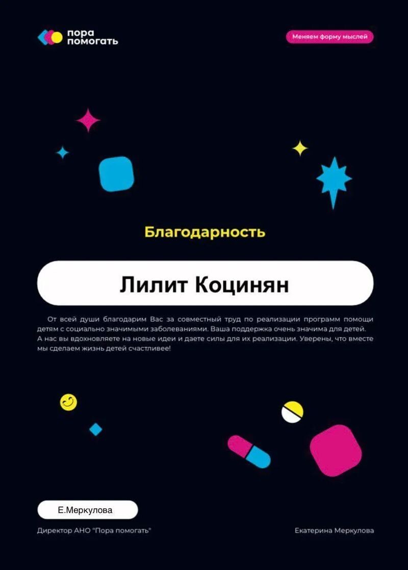 - Фонд «Пора Помогать», благодарность, 2022 г.