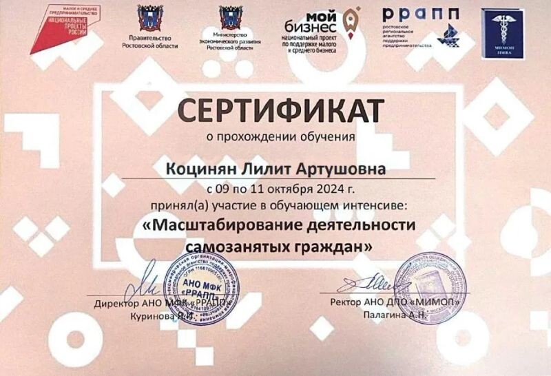 - Обучающий интенсив «Масштабирование деятельности для самозанятых граждан», 2024 г.