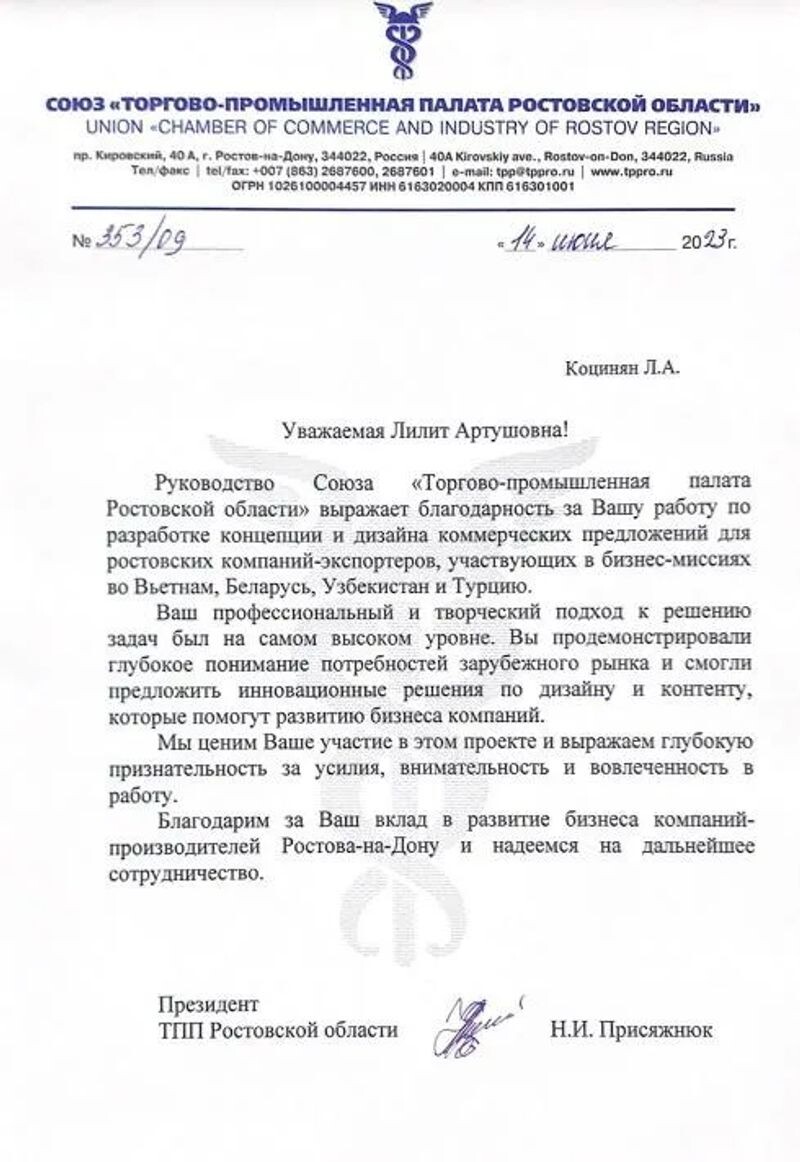 - Союз «Торгово-промышленная палата Ростовской области», благодарственное письмо, 2023 г.