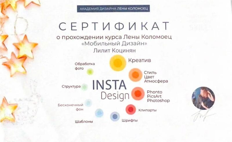 - Академия дизайна Лены Коломоец, сертификат о прохождении курса Лены Коломоец «Мобильный дизайн», 2019 г.