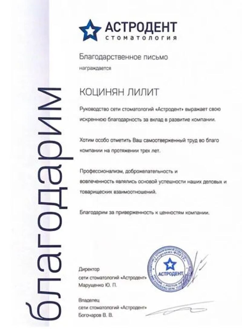 - Стоматология «Астродент», благодарственное письмо за вклад в развитие компании, 2021 г.