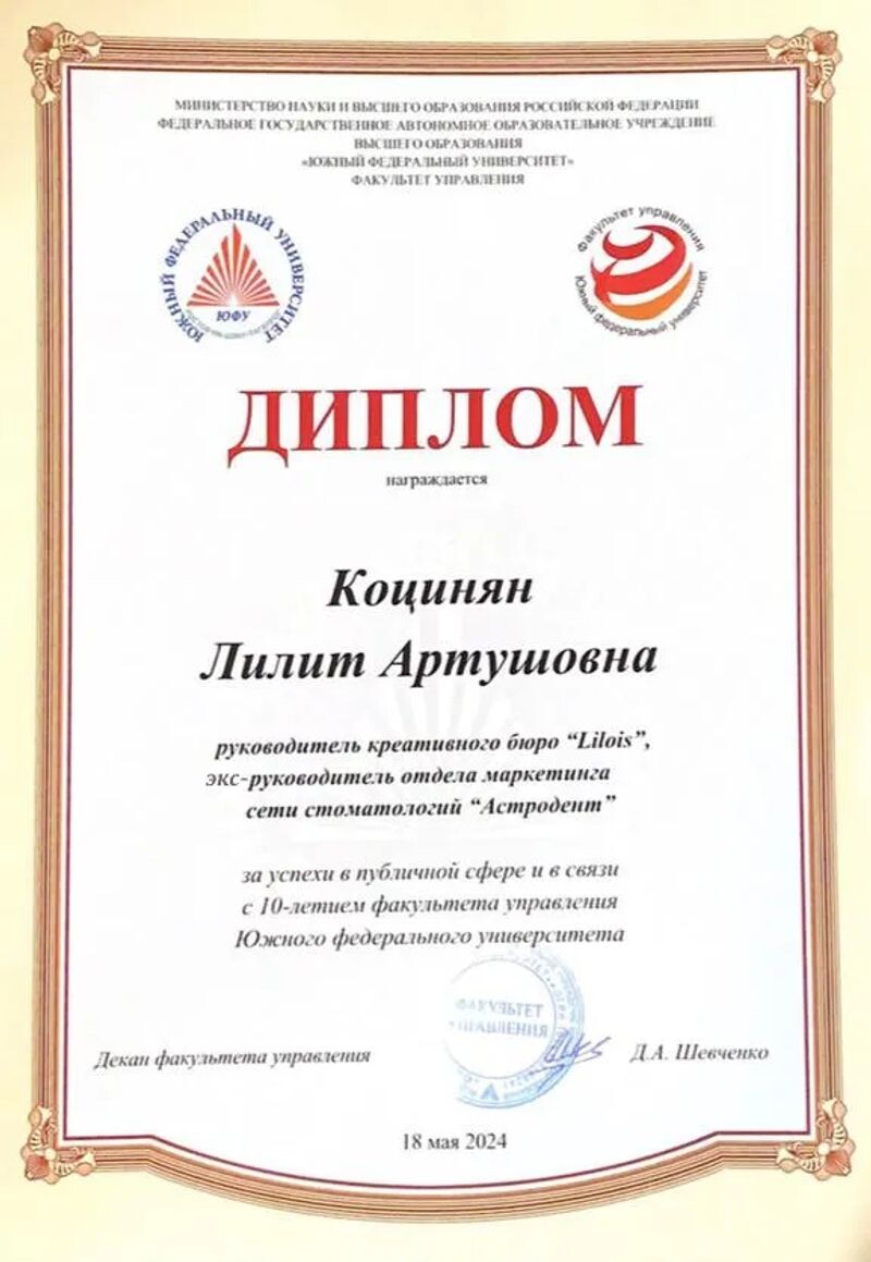 - Южный федеральный университет. Диплом за успехи в публичной сфере и в связи с 10-летием факультета управления, 2024 г.