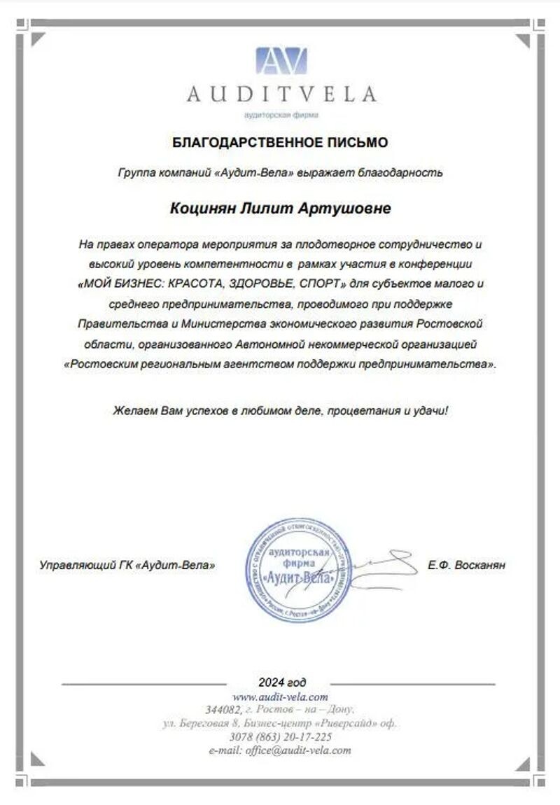 - Группа компаний «Аудит-Вела», благодарность за выступление в конференции, 2024 г.